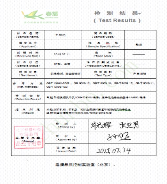 特别感谢长江校友EMBA22期周松校友所在机构春播的品质控制实验室为善果枸杞的鲜果和干果进行质量检测,检测结果未发现任何重金属和农药残留,完全符合质量标准,请大家放心食用啦!
