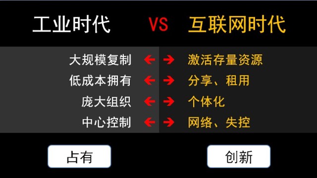 第一是我们一定要致力于做出与往不同或者是与众不同的。我们中国人创业特别喜欢走另外一个路径,就是别人已经把这个事干成功了我也去干,我觉得这个就比较麻烦了,这就不是很容易做的事情了。当然我觉得这有一个基本的方法论大家都谈的很多了,工业时代和互联网时代的基本的方法大致来说,特别是站在易到的角度,我自己认为简单来说我们应该做创新创造和占有的人。大家看看这个逻辑应该怎么理解,我就在想更具体一点就是互联网的例子,跟大家谈一谈我们是怎么思考互联网时代的产品的,或者说哪些行业可能被互联网改变呢?我觉得今天谈互联网,但再过两三年就没有互联网行业了,为什么?因为所有的行业都会被互联网化。越腐朽的行业越需要被互联网颠覆。怎么去判断一个行业的腐朽指数呢?我觉得有这么几个基本的特征,第一是高毛利低净值;第二是重渠道轻品牌。