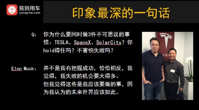 最后我想跟大家谈谈关于创新的事情,我觉得大家在谈及创新的时候我自己认为通常有这么一些偏见,哪些东西呢?我跟特斯拉的创始人见过几次面,我问他我说你为什么要同时做三件不可思议的事,特斯拉、SpaceX、SolarCity这三件事呢?你hold住吗?他说并不是我有把握成功,恰恰相反我觉得我失败的机会要大得多。但是我觉得这些应是我要做的事情,因为我认为未来的世界就应该是这样子的。真正的牛人是这样思考的。虽然他也差点破产了,但我们应该向这样的人来学习,他多么有勇气。