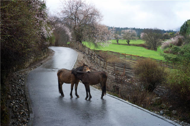 雨后的岗乡,静谧得有点孤寂,悄然走来两匹马,惊动了画面,举起相机的时候,它们居然耳鬓厮磨起来。有时候在路上,上天给予的比我们要的还多。( 摄于:林芝 2013年4月)