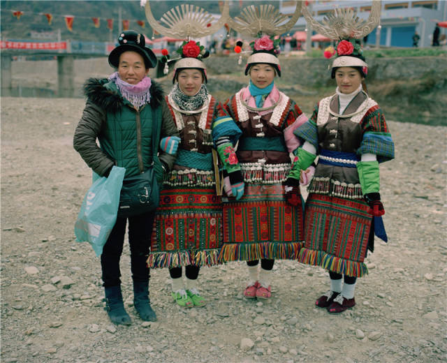 苗族芦笙舞会上,妈妈说:我不漂亮,你就拍我三个女儿好了。我说不对啊,你们是4朵金花!(摄于:贵州石城 2014年2月)