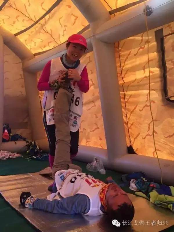 [在戈壁路上,在营地里,都可以见到QQ姐给队员们进行专业拉伸训练的身影。“有些路很远,苦累艰难都是修行,戈壁不是终点,人生的意义就在去戈壁的路上!”这是QQ姐对于戈壁的感悟]