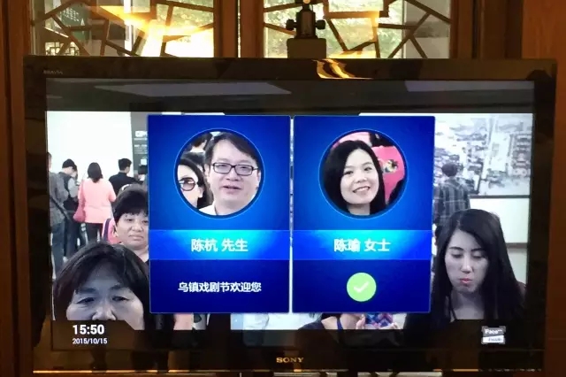 [来宾体验face+人脸识别系统,这也是国内首次将该技术应用在大型活动的安全检录中]