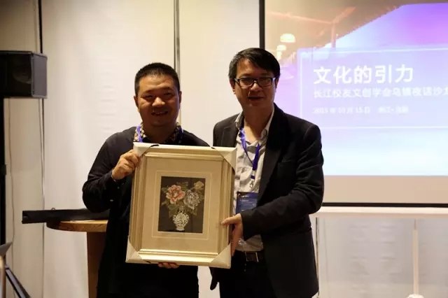 校友介绍完毕后,现场不记名投票选出大家最感兴趣的校友,最终,EE文创二期校友、北京龙杰网大文化传媒有限公司董事长朱国勇当选“人气王”,陈杭会长为他颁发了奖品——乌镇传统丝织手工艺品乌锦一幅。借助于这种新颖的互动交流形式,现场气氛十分热烈,在大家意犹未尽的交谈中,结束了第一天的行程。