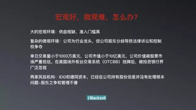 我在PPT里面提到的另一个案例,微观不好怎么办? 这是在纳斯达克走后门上市的企业,泰邦生物集团,China Biologic。这个企业是做血站的。中国没有一个义务献血的传统,大部分的血都靠贫穷的地区老百姓来献血。这家公司在全国好几个省都已经设了血站,血站建立起来以后,现金流非常好,因为血是稀缺资源的,大家都是先给钱,才能拿血。