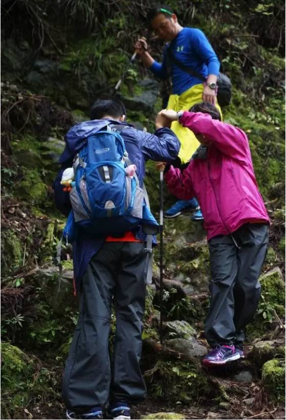 [益行队员在互相搀扶下,翻山越岭]