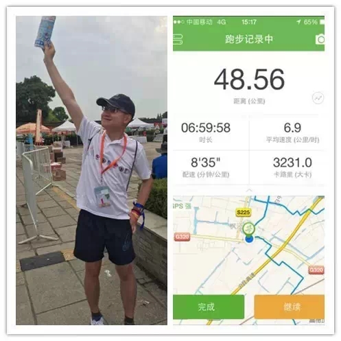 约下午三点左右,郑教授便完成了前三个打卡点,已然超越了去年的成绩。由于当天天气炎热,同学们纷纷善意地劝诫教授以身体为重。郑教授微汗的脸庞再次洋溢起坚定的微笑,大步流星地向第四打卡点走去。当走过42公里的第四打卡点时,郑教授的护踝和护膝早已湿透,四肢已略显浮肿。全国各地校友正在微信群里关注着这场公益践行,无不为郑教授的壮举所感动。“这最后八公里,我不走怎么会知道我不行呢?”适当调整了走路姿态、略做补给后,郑教授向50公里终点发起了挑战。夕阳西下已是晚上七点,当教授出现在50公里终点打卡点的时候,从现场到微信群皆一片欢腾,教授用实际行动演绎了一次“老骥伏枥,志在千里”,让大家再次领略了长江人身上的坚毅品格!