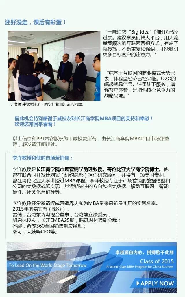长江“资深导师计划”始于2009年,目的是让长江MBA同学有机会获得各行业资深人士的指导和帮助。2014级MBA学生与导师的比例是1.8:1,即平均一位导师专心指导两位同学。各位导师会专门抽出固定时间与学生沟通交流,为他们答疑解惑。通过与导师一对一交流,MBA学生对个人职业发展、兴趣爱好等将获得更清晰务实的了解,并能够向这些商界成功人士学习成功之道。
