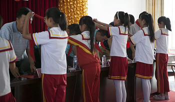 [谢臣小学的少先队员向长江学员献上红领巾]