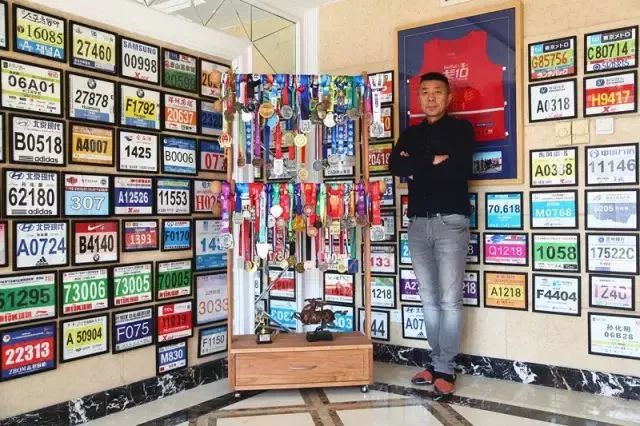 ▲孙化明跑过的马拉松号码牌和奖牌可以贴满两面墙