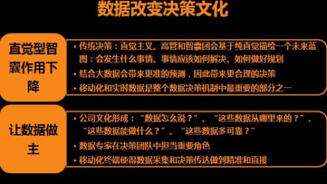 具体表现为:决策者将结合大数据进行更准确的预测,从而带来更合理的决策,移动化和实时数据会成为我们整个决策机制里最重要的部分;同时,数据专家在决策团队中将承担越来越重要的角色,移动终端会使整个数据采集和角色传达达到非常精准和直接的程度,影响整个决策的质量。