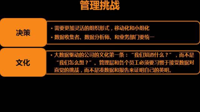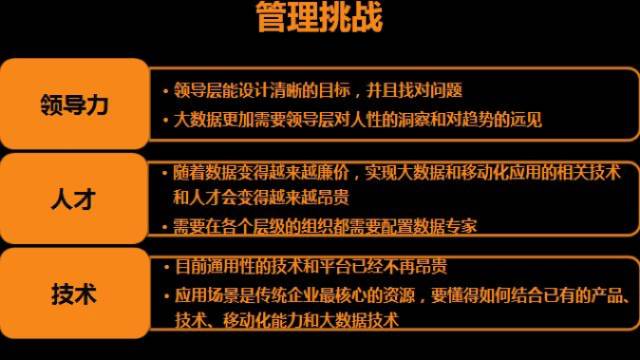 在整个移动化和基于数据决策的管理中,我们也会碰到许多新的挑战,主要体现在领导力、人才、技术、决策和文化方面: