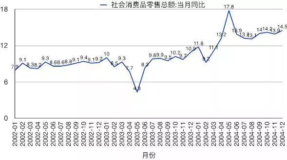 图表1:2002-2004社会消费零售总额当月同比增速(%)
