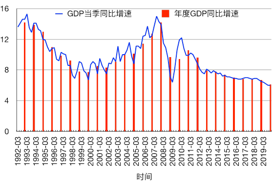 图表2:1992-2019季度和年度GDP(不变价)同比增速(%)