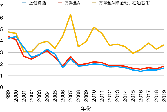 上市公司的ROA在2001、2002年探底,随后一路上扬直到2008年全球金融危机,在“四万亿”刺激计划后有所恢复,2010年是个高点,此后则开始下行。相比于非金融企业,金融业上市公司的更低,这从上证综指、万得全A两个指数的ROA要低于万得全A(除金融、石油石化)可以看出来。