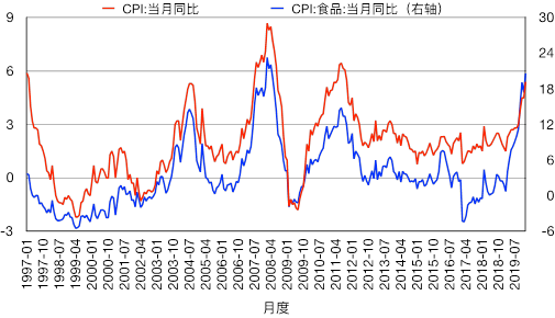 在2002年,CPI都是负增长的,即经济正处于通货紧缩,直到2003年1月份CPI才重回正增长的轨道。在2003年的前8个月,通货膨胀率都低于1%,在后四个月才在政策刺激下上升到1%以上。而近期由于食品价格上升的影响,通货膨胀率节节攀升。在2020年1月,通胀率是5.4%;而食品价格指数增速更是高达20.6%。