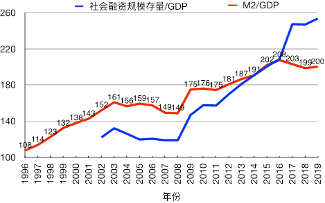 我们的信贷规模也在增长。2003年M2与GDP的比例是161%,在2019年这个比例是200%。社会融资规模存量占GDP的比例也从2003年的132%上升到了2019年的254%。