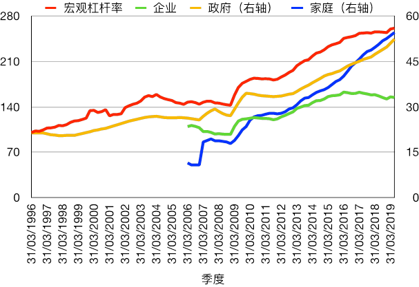 图表11:1996年至2019年2季度宏观和分部门杠杆率(%)