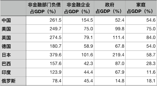 一个国家的宏观杠杆率是非金融部门负债与GDP的比例。而非金融部门包括非金融企业、政府、家庭等三个部门,不同部门的杠杆率定义为各自部门负债与GDP的比例。