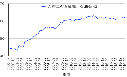 图表13:2002年至2019年3季度万得全A(除金融、石油石化)指数资产负债率(%)