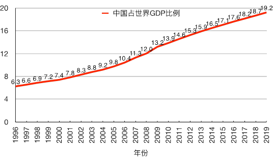 图表14:1996-2019年中国GDP占世界GDP比例(%)