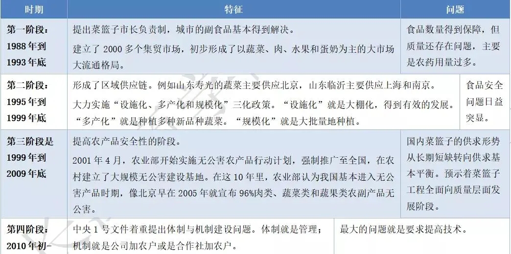 技术、制度,交替前行。在1982年《中国农业资源调查报告》,1984年“商品粮基地”等一系列调研、实践的基础上,1988年5月,农业部提出《关于发展副食品生产保障城市供应的建议》,即此后广为人知的“菜篮子工程”——核心在于因地制宜的“划片”组织生产和供给,即有效的组织“供应链”。