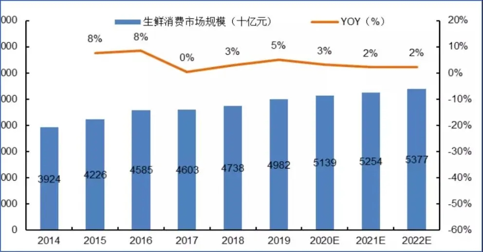 随着时代的变迁,广义的“菜篮子”,已经逐步以“生鲜”这个更为现代消费者熟悉的词汇所代表。根据Euromonitor数据显示,目前生鲜食品是国民生活必需的消费品,购买频次约为3次/周,高于全球平均的2.5次/周。2019年国内生鲜零售市场总额达到5万亿元,同比增长5%,2014-2019年CAGR为4.9%,呈稳步增长态势,预计2022年市场规模将达到5.4万亿元。