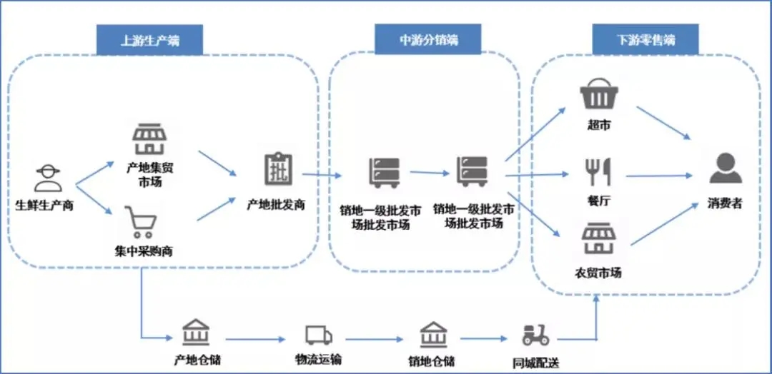 由于生产端的分散,地域的广袤,原产地的采购一般由“产地”的采购商进行(中间也许还存在不出资收购单纯做中介的“菜行”、“蔬菜经纪人”等角色),采购商收购完成后,在当地的批发市场出售给“产地”批发商,随后通过物流运至“销地”的一级农产品批发市场(往往跨几个省市),再进入“销地”的二级批发市场(往往专注一个省市),随后进入超市、餐厅、社区农贸市场这一类终端零售商,最终销售给消费者。