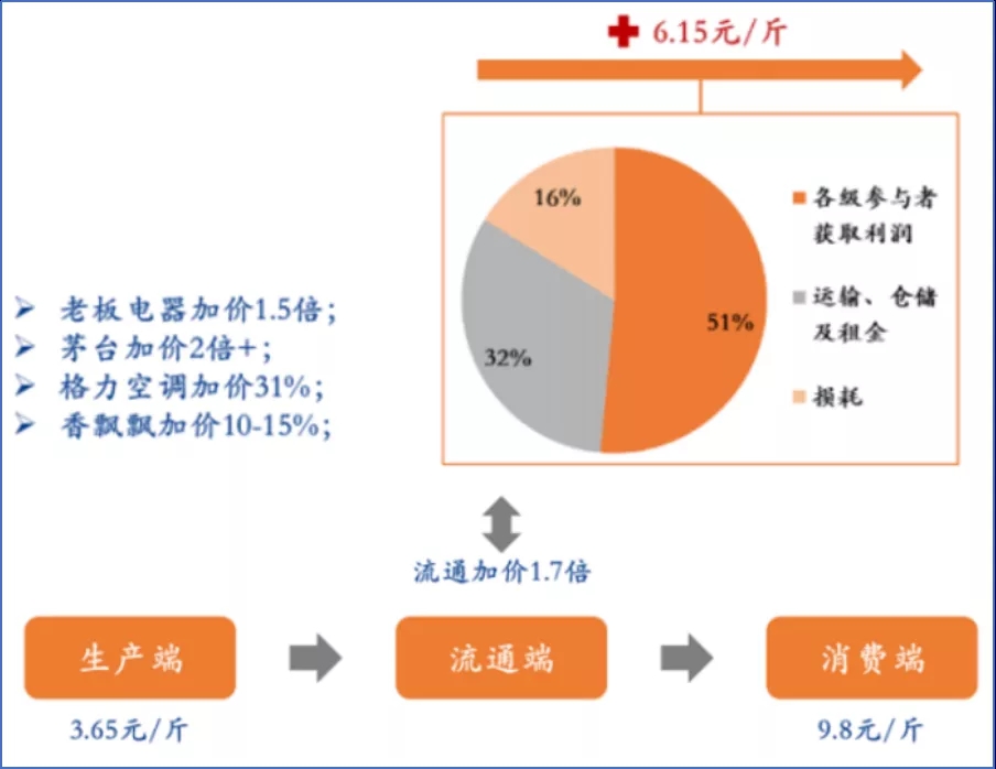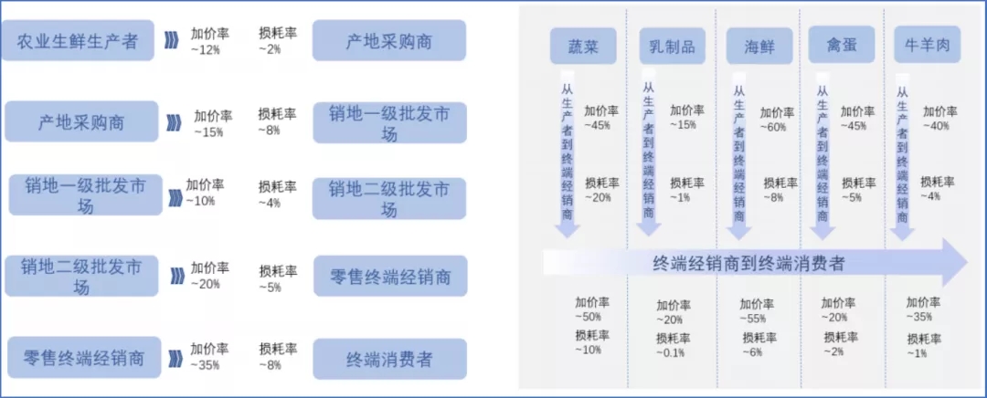 粗略估算,从生产者到消费者,生鲜产品的流通至少要经过五级流通环节。这些环节中又往往存在多级角色。除零售环节外的流通环节中,每次转手加价范围在10%-20%之间,同时损耗在5%上下。零售环节则加价30%-50%,损耗率在8%左右。