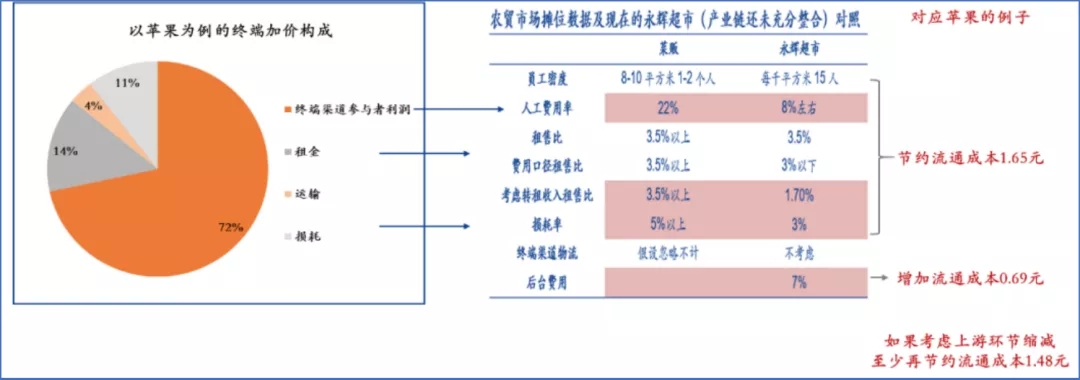 压缩多级渠道、冷链降低耗损、提高单位摊位面积的人效(农贸市场8-10平方米摊位需要1-2名个体劳动者,而超市大店的员工密度是15人/千平方米)、降低租金比(超市通过整租及转租降低单位面积租金)……经过机构测算,对应一斤苹果,以上环节一共节省了1.65元,虽然超市因为企业化运营增加后台费用(占营收比重约7%,对应一斤苹果是0.69元),但其大部分可以通过规模化分摊……综合而言,对应9.8元/斤终端价,理论上可以压缩到7.36元/斤(便宜30-40%)。