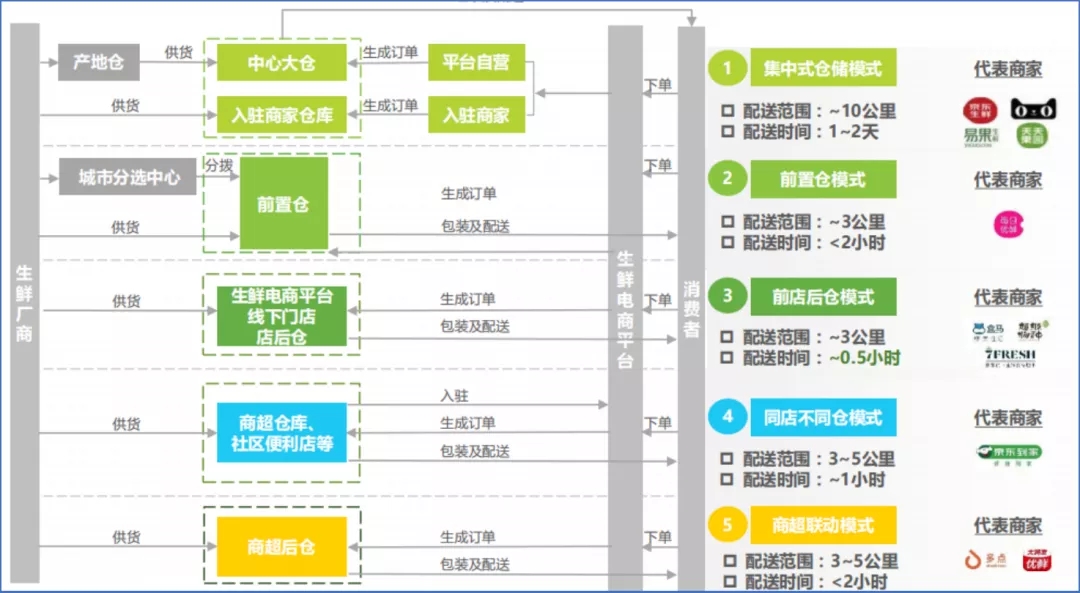 相对于“强生鲜供应链”模式。还有其他几种模式正在尝试对生鲜供应链进行优化。分别是集中式仓储模式(京东生鲜、天天果园)、前置仓模式(每日优鲜)、前店后仓模式(到店+到家)(盒马鲜生、7fresh)、同店不同仓模式(京东到家)、商超联动模式(多点)。其中巨头较多密集在前店后仓模式,通过冷链物流建设仓储网络,其配送效率最高,仓储成本较低,线上线下流量较其他模式更容易互通,但配送范围存在一定局限。