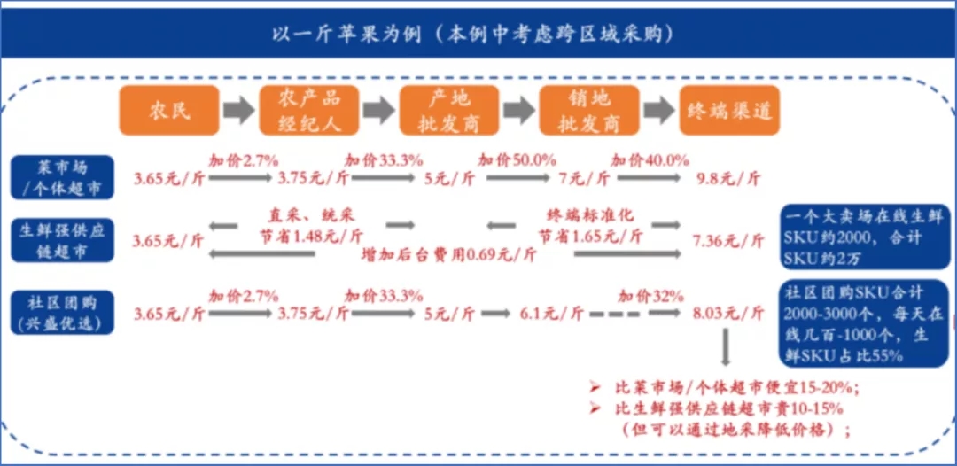 其中社区团购在近年异军突起,虽然其在补贴、微信拉流量等方面“复刻”了互联网的“野蛮成长”,因此备受争议,但抛开这些,其模式本身对于生鲜供应链利润模型存在一定改进,其产生的不同供应链成本与价格对比情况如下图: