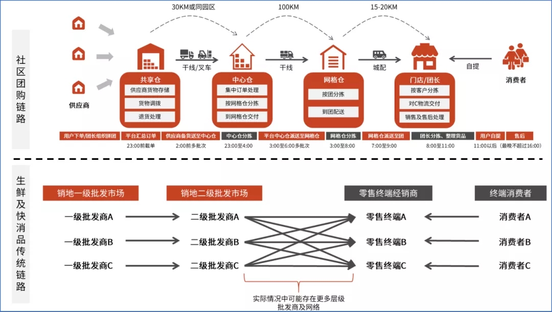相比于传统生鲜供应链网络,社区团购压缩了多级流通环节,并且带有C2M按需供货的要素,大幅降低损耗。而对比生鲜电商,社区团购采用门店自提,没有了最后一公里送货上门的问题,大幅降低履约成本。同时其仓储大量采用加盟方式,销售采用团长方式,将各环节压力和风险进行了分散。
