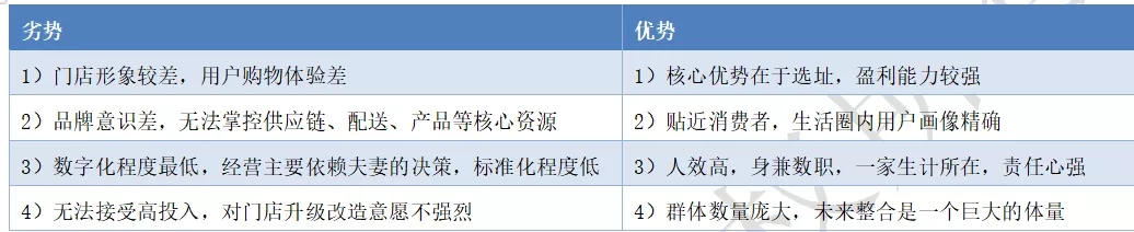 在供给端,正如上文所说,夫妻店长期依靠烟酒、饮料、日杂百货作为主销品类,缺少生鲜这一类高频消费品聚拢人气,同时600万家夫妻小店是离居民最近的商业“毛细血管”,但商业模式最传统,处于供应链最末端,采购价高、商品结构单一、质量无保障、抗风险能力弱。