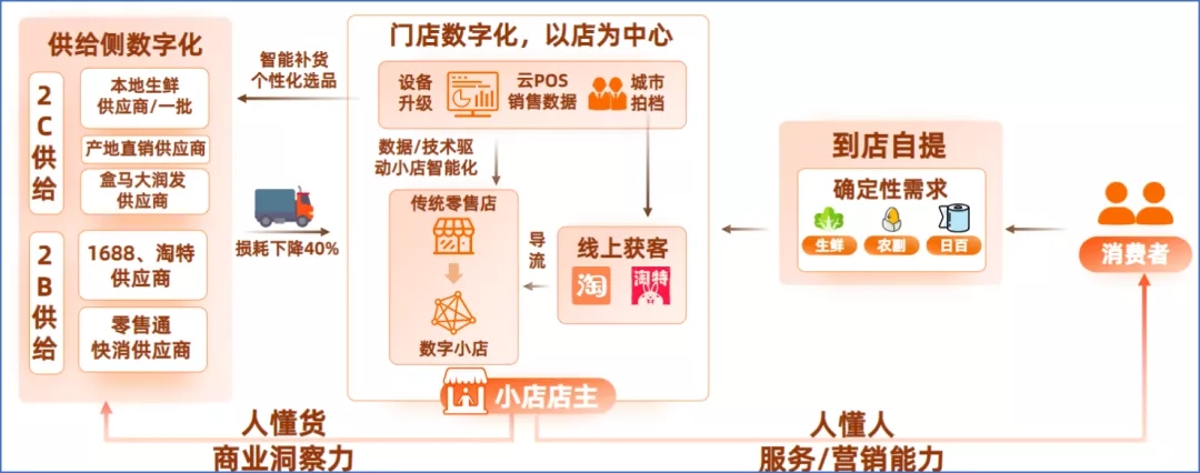 这些“夫妻店”的“数字化”,显然成为互联网企业的目之所及。所以此前数年,阿里推出“零售通”,京东推出“新通路”,简言之,都是提供一套数字化平台,给“夫妻店”提供进货、收银、物流、库存管理等能力。其中阿里凭借对更广泛的用户需求的了解、更多货源、更多金融解决方案、结合菜鸟网络,能够给予夫妻店更大帮助,因此获得较大发展。访谈中获知,在2021年前后,零售通已进入近150万家夫妻店,以较大优势成为这一领域的领先者