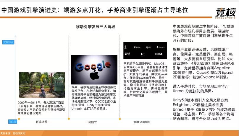 仔细复盘对照东西方游戏引擎演进路线,不难发现差异极其明显。正如笔者在《75页游戏引擎研报:3A较难推动国产inhouse引擎,东西方路径差异明显》中指出,3A较难推动国产inhouse引擎,东西方路径差异明显。端游时代中国游戏厂商自研引擎多点开花。手游时代历经三个阶段,现在已进入商用引擎Unity、Ureal分庭抗礼的局面。