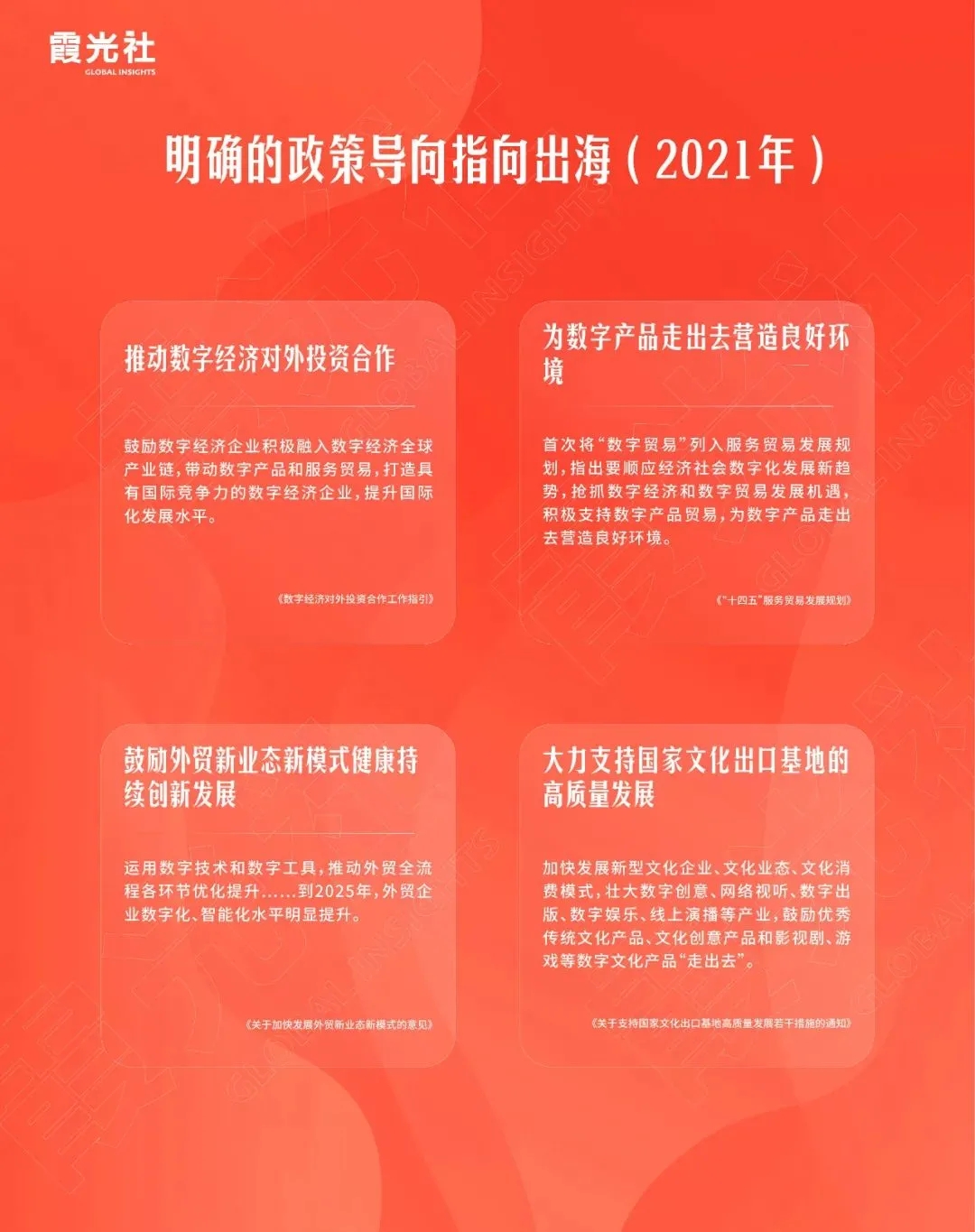 7月,商务部、网信办、工信部联合印发《数字经济对外投资合作工作指引》,鼓励数字经济企业加快布局海外研发中心、产品设计中心,开展数字技术产业化国际合作,加快国外先进技术与国内产业化优势对接融合;