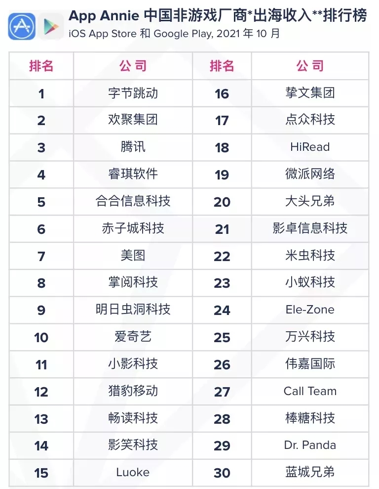 2021年10月,App Annie推出了“中国非游戏厂商及应用出海榜单”。令人意外的是,收入Top30的榜单上,工具类厂商占到了1/3,睿琪软件、合合信息等名列前茅。