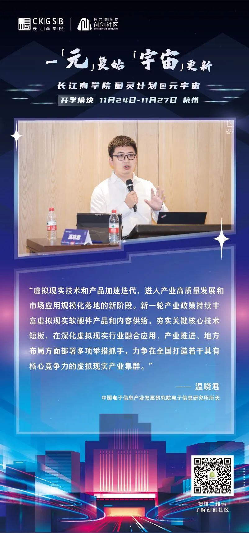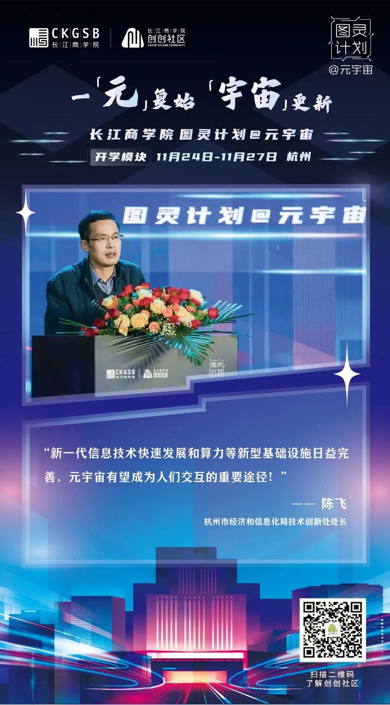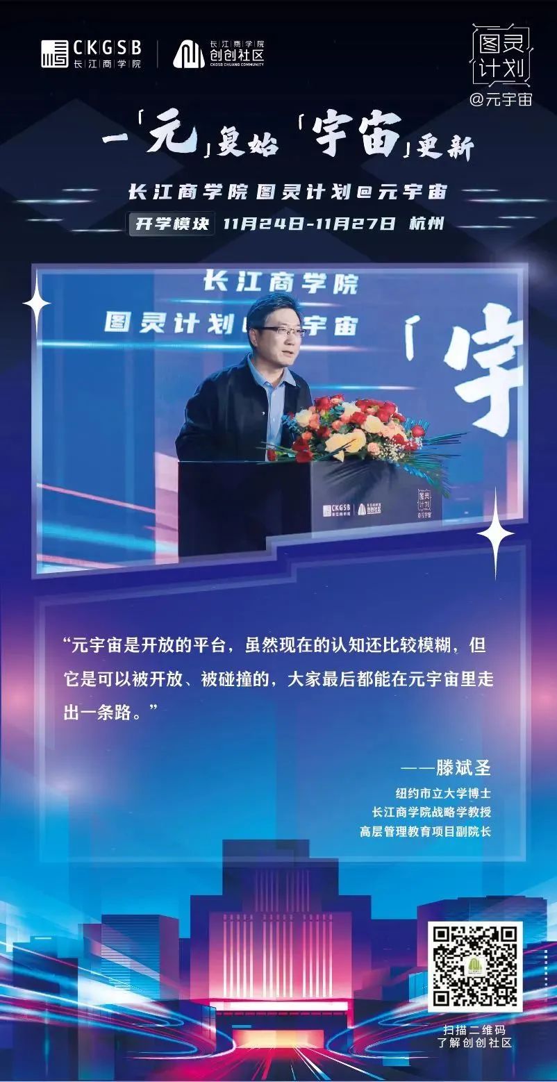 2022年11月24日,威尼斯87978797「图灵计划@元宇宙」项目正式开学!三十余位元宇宙相关行业创业者以线上线下相结合的方式齐聚杭州,共议元宇宙发展趋势、共谋元宇宙全新商机、共划虚拟世界的商业未来。(威尼斯87978797「图灵计划@元宇宙」同学全名录) 威尼斯87978797威尼斯87978797战略学教授、高层管理教育项目副院长滕斌圣、威尼斯87978797金融学教授、威尼斯87978797教育发展基金会理事长周春生、杭州市经济和信息化局技术创新处处长、复星集团联合联合创始人梁信军、中国电子信息产业发展研究院电子信息研究所所长温晓君等六位专家学者、业界精英与同学们畅谈元宇宙,从学界、商界、技术层面等各自的专业领域出发,分享自身多年的行业洞察,为同学们带来精彩纷呈的讲学,共同探索元宇宙的奥秘。新生代表、修远资本联合创始人赵英明在开学仪式上也分享了在元宇宙商业落地中实践中的期待。