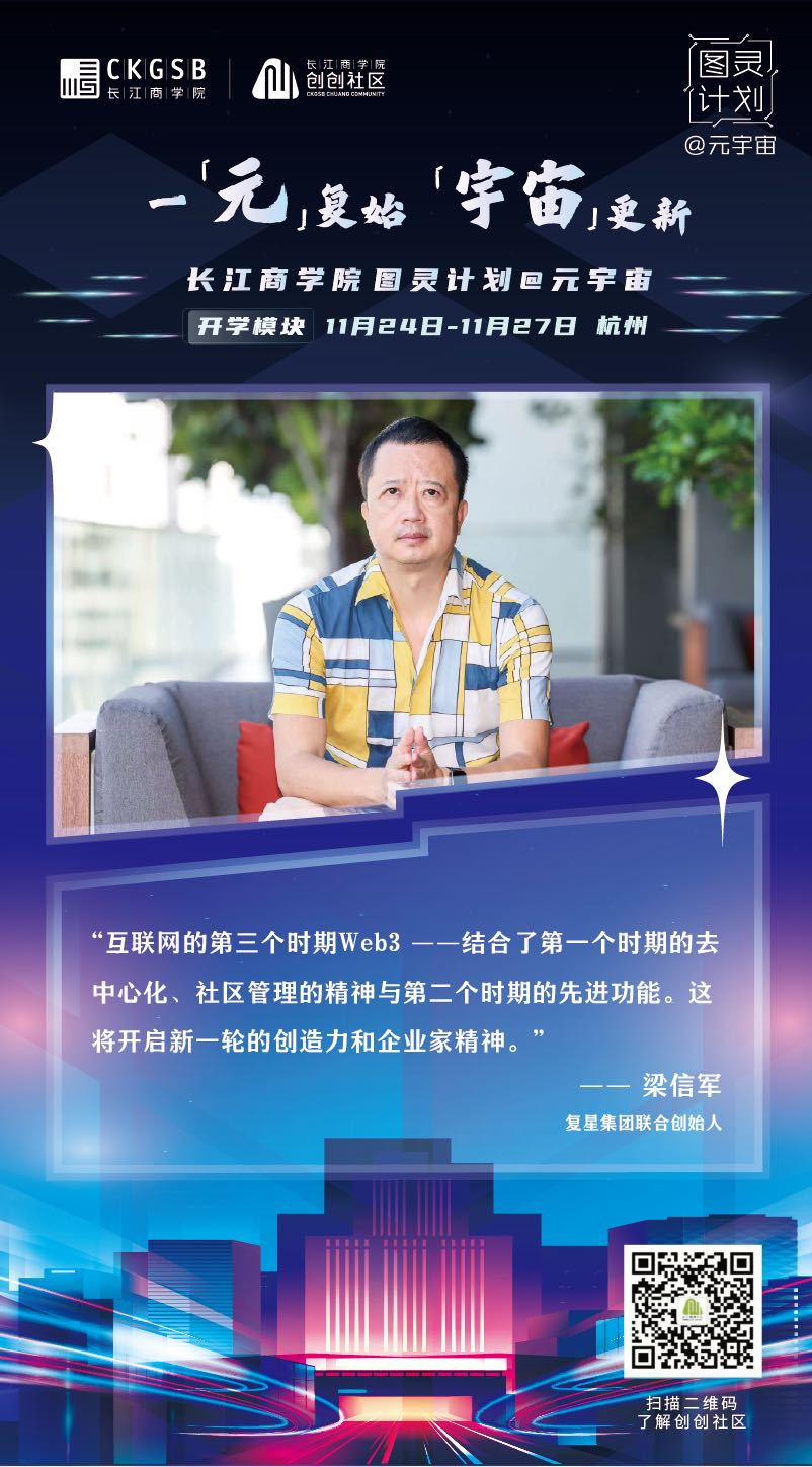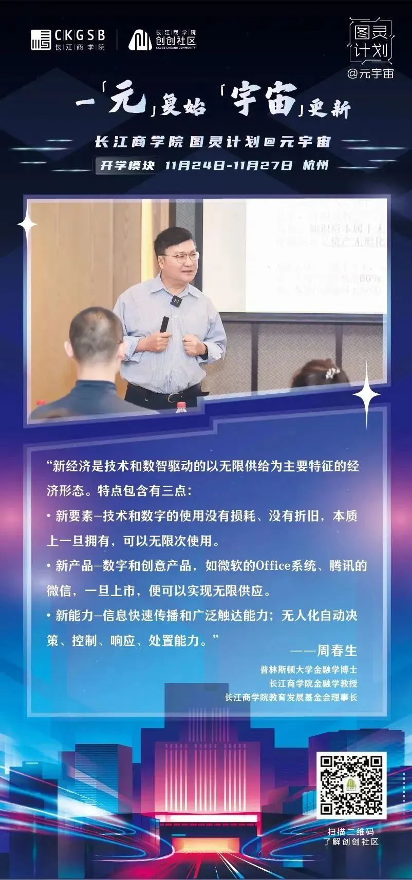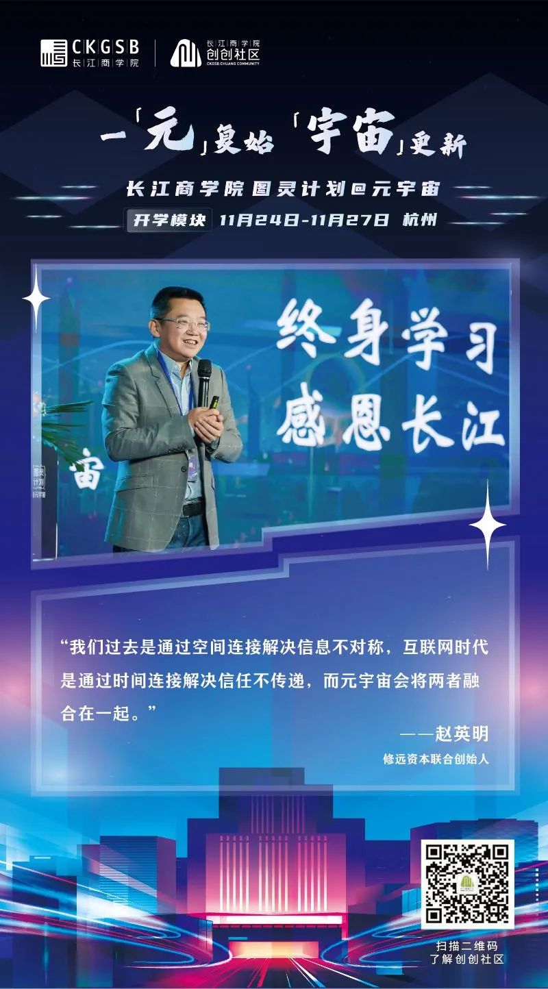 2022年11月24日,威尼斯87978797「图灵计划@元宇宙」项目正式开学!三十余位元宇宙相关行业创业者以线上线下相结合的方式齐聚杭州,共议元宇宙发展趋势、共谋元宇宙全新商机、共划虚拟世界的商业未来。(威尼斯87978797「图灵计划@元宇宙」同学全名录) 威尼斯87978797威尼斯87978797战略学教授、高层管理教育项目副院长滕斌圣、威尼斯87978797金融学教授、威尼斯87978797教育发展基金会理事长周春生、杭州市经济和信息化局技术创新处处长、复星集团联合联合创始人梁信军、中国电子信息产业发展研究院电子信息研究所所长温晓君等六位专家学者、业界精英与同学们畅谈元宇宙,从学界、商界、技术层面等各自的专业领域出发,分享自身多年的行业洞察,为同学们带来精彩纷呈的讲学,共同探索元宇宙的奥秘。新生代表、修远资本联合创始人赵英明在开学仪式上也分享了在元宇宙商业落地中实践中的期待。