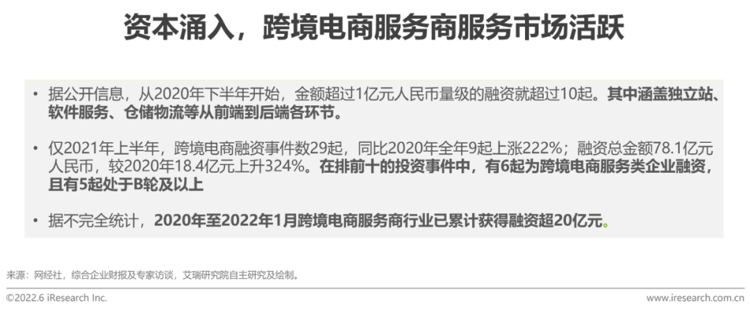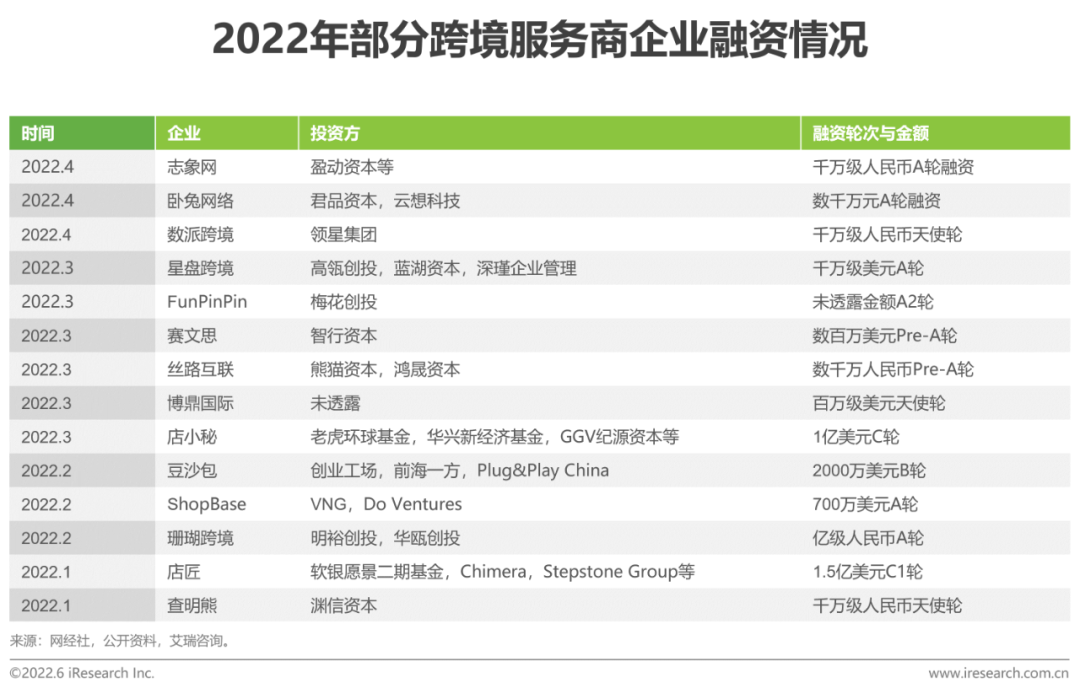 随着跨境电商行业的不断成熟和分化,市场对于能提供专业产品及服务的跨境电商服务商需求越来越大,引起了资本市场的广泛关注,跨境电商服务商企业借助资本的力量不断精进自身专业性,为跨境电商行业创造更多价值。