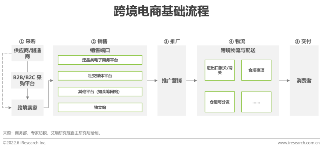 跨境电商基础流程可分为采购、销售、推广、物流和交付等环节。商务部将中国电子商务服务业分为交易型服务即以促进网上交易为目的的电子商务交易平台服务、支撑型服务即围绕电子商务的物流、资金流及信息流等方面而开展的服务、衍生型服务即伴随着电子商务应用的深入发展而催生的各类专业服务,其中衍生型服务主要在1-2个环节上为企业赋能,支撑型和交易型服务则一般赋能3-5个环节。