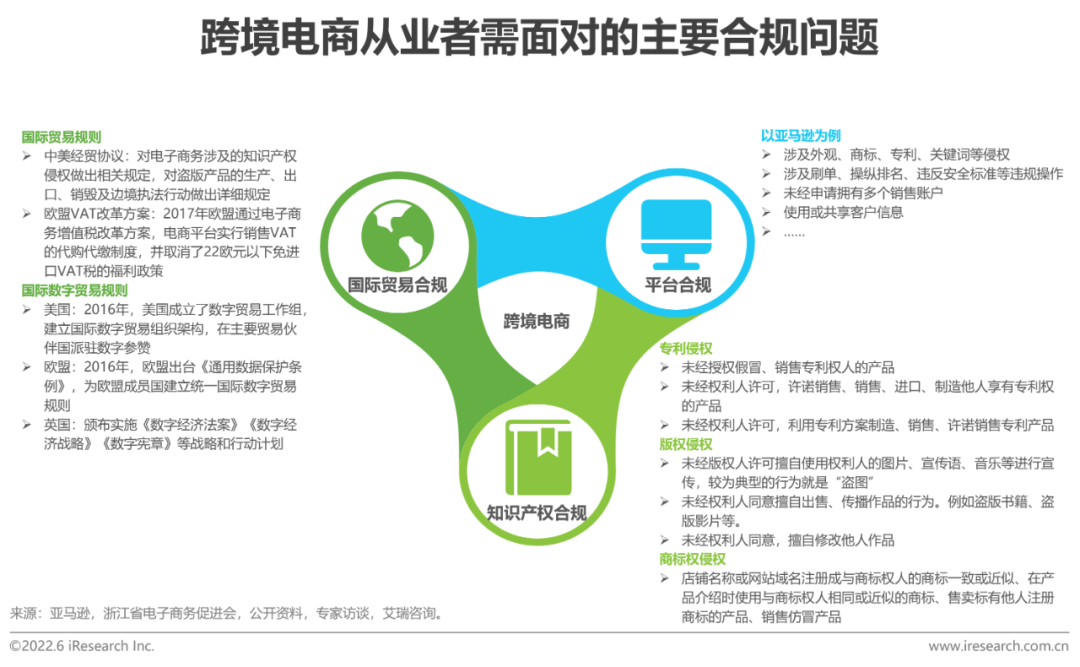 受疫情影响,在全球经贸摩擦加剧的大环境下,跨境电商行业正在经历来自国际贸易层面、知识产权层面和平台层面的合规化约束,一批批为提高营收利润选择铤而走险打“擦边球”的跨境电商企业在合规化的浪潮中被快速淘汰,其中不乏许多业内耳熟能详的头部企业。对于跨境电商行业而言,合规化宣告着市场由野蛮生长的时代逐渐过渡到理性繁荣的时代。快速精准了解各类合规政策,在合规前提下重铸良性商业闭环,成为了当下跨境电商行业参与者必须面对的重要问题。