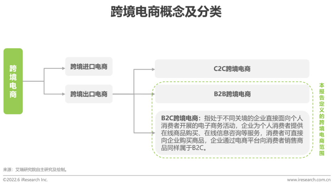 跨境电商(广义):广义上,跨境电商基本等同于外贸电商,是指分属不同关境的交易主体,通过电子商务的手段将传统进出口贸易中的展示、洽谈、成交等环节电子化,并通过跨境物流送达商品、完成交易的一种国际商业活动,既包含B2B 模式,也包含 B2C 模式;同时,随着互联网的发展,产生了C2C模式。