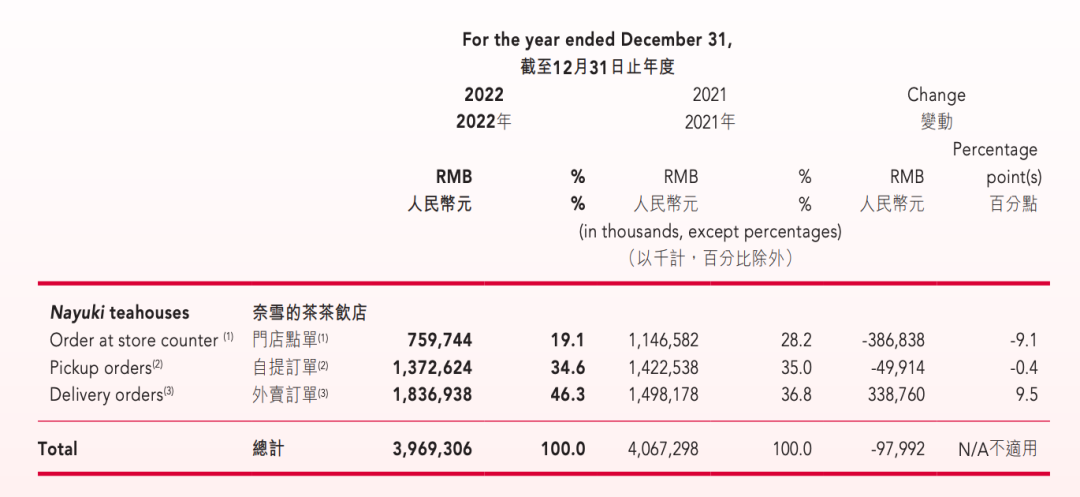 具体来看,奈雪2022年门店点单和自提订单产生的营收分别为7.6亿元和13.7亿元,均出现同比下降,而来自外卖订单的营收却从2021年的14.98亿元增长到了18.37亿元。这里面可能有疫情的影响,但这种消费降级的趋势也很有可能延续下去。