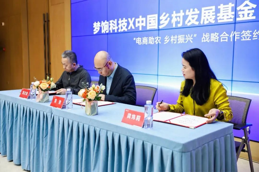 中国乡村发展基金会执行副理事长刘文奎、梦饷科技总裁章弛、橄榄时光董事长龚炜莉等共同出席“电商助农、乡村振兴”战略合作签约仪式。