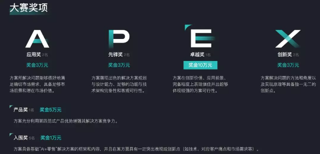 本次比赛共设置应用奖、先锋奖、卓越奖、创新奖4类大奖,分别从创新价值、方案可行性、应用前景、完备程度等方面进行评判。此外,针对利用第四范式产品增强其解决方案竞争力的优秀项目,大赛特设产品奖一名;另大会设置多名入围奖,以鼓励参赛者勇于创新的思维和行动。部分获奖项目有可能获得国内顶级VC投资的机会。