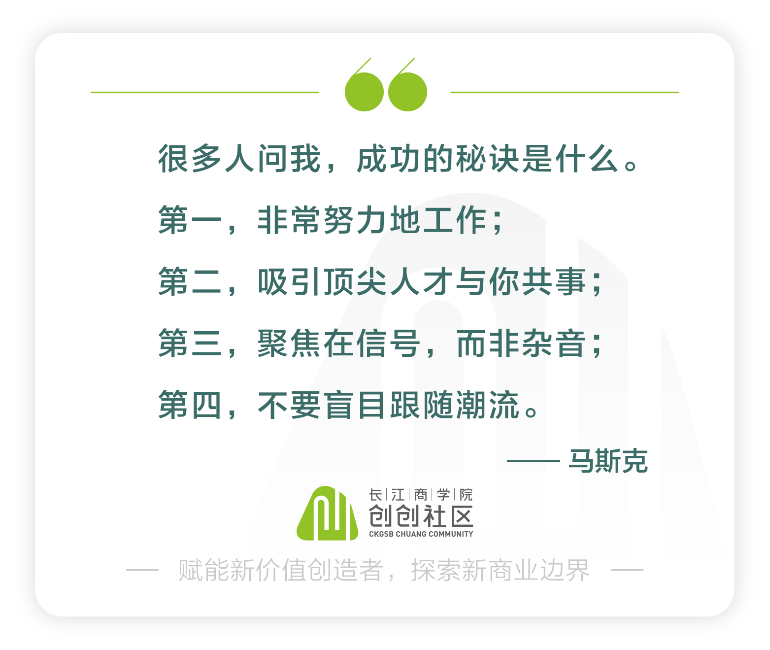 第三,聚焦在信号,而非杂音(signal over noise):很多企业混淆了焦点,花很多钱去做一些不会让产品变得更好的事情。在特斯拉,我们从不做广告,而是把钱投入研发和生产设计,不断改进产品。每家公司都应该自问,我们所做的这些事情,到底有没有让产品或服务更好,如果没有,就应该喊停了。