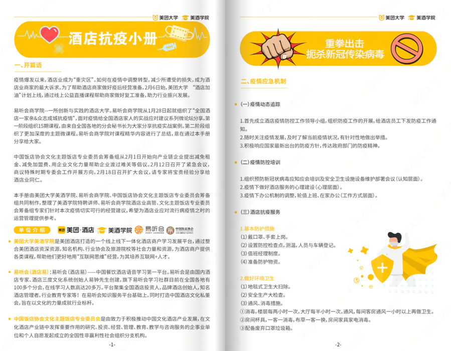 我们会从客户预定,到进我们的门店,然后做登记、体检,还有一些扫二维码,还有消毒措施,无接触,以这个方式做的流程建议的倡议书。大家只要按照这个流程来,包括每天的消毒消杀,分餐制,就可以把你的酒店列入安心住酒店,或者是防控比较好的酒店。我们跟美团这边一起还做了一个抗疫服务指南,从疫情发生开始,门店的防疫工作,后期的运营提升。我们做了一个电子书,这个书还在审核当中,没有对外发布。
