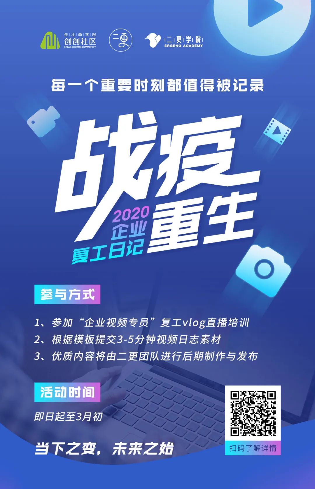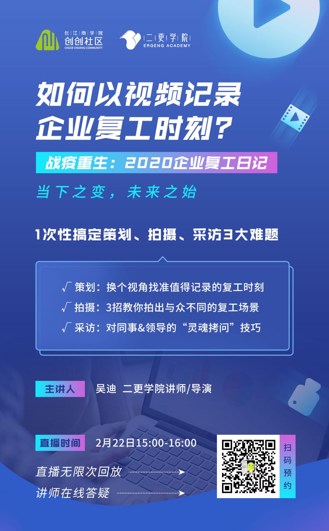 当然,如果你还是对视频拍摄技巧存在疑惑,不用担心!我们特地邀请了二更学院的讲师,手把手教你制作3-5分钟的简版Vlog,以更新更广的思路来记录企业复工这一刻!